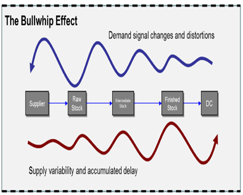 “Bullwhip Effect–An extreme change in the supply position upstream in a supply chain generated by a small change in demand downstream in the supply chain. Inventory can quickly move from being backordered to being excess. This is caused by the serial nature of communicating orders up the chain with the inherent transportation delays of moving products down the chain. The bullwhip effect can be eliminated by synchronizing the supply chain”.