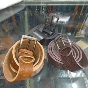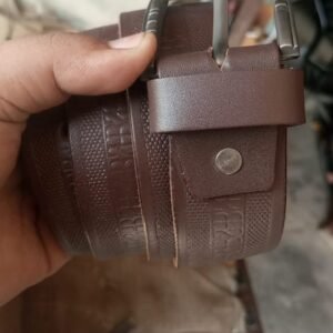 Leather belts are produced from high-quality leather and feature a robust and durable design. The belt is crafted from premium leather, evident from its textured finish and solid construction. The belt has a sturdy metal buckle with a simple yet stylish design, adding elegance. The leather is rich in color, likely a deep brown or black, making it a versatile accessory that complements casual and formal outfits. The belt also appears thick and strong, ensuring longevity and reliability for everyday use. The craftsmanship and materials suggest that this belt is functional and a stylish addition to any wardrobe.
