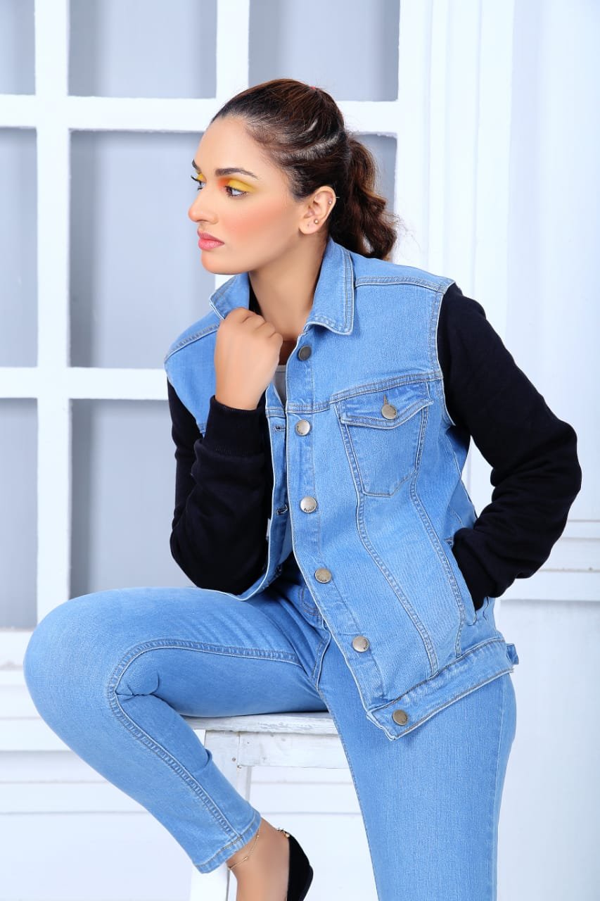 • Fit: Tailored to fit snugly, the jacket contours to your shape, providing a flattering silhouette. The model wears it with matching blue skinny jeans, emphasizing a cohesive and trendy look.