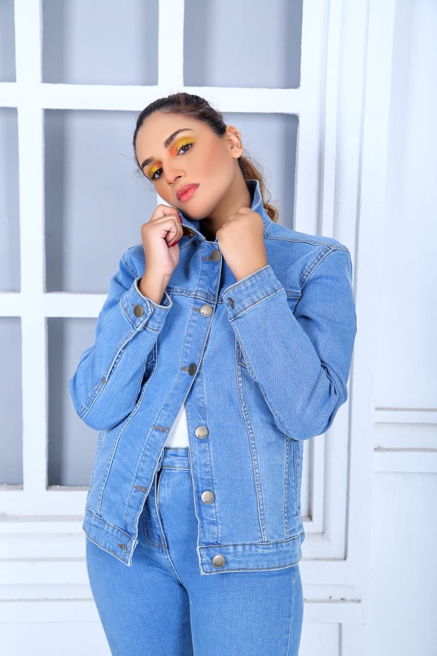 • Fit: Tailored to fit snugly, the jacket contours to your shape, providing a flattering silhouette. The model wears it with matching blue skinny jeans, emphasizing a cohesive and trendy look.